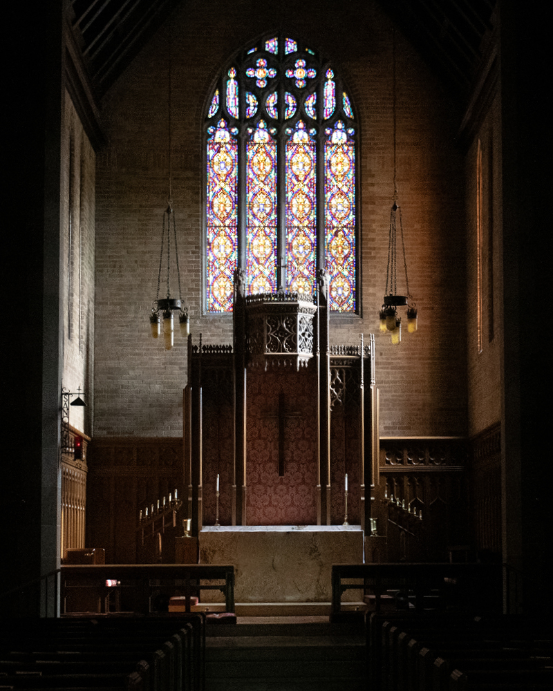 Completed in 1931, the Gothic exterior is underwhelming. It’s the interior that’s more artful and dramatic. Worshipers enter a dark, narrow narthex, then, quite suddenly, the space opens to a vaulted expanse with magnificent stained glass windows.